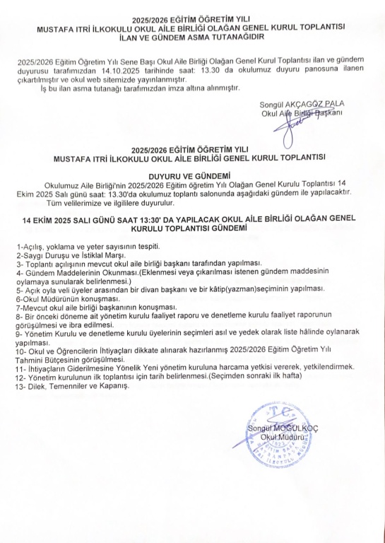 2025/2026 Eğitim Öğretim Yılı Sene Başı Okul Aile Birliği Olağan Genel Kurul Toplantısı ilan ve gündem duyurusu tarafımızdan 14.10.2025 tarihinde saat: 13.30 da okulumuz duyuru panosuna ilanen çıkartılmıştır ve okul web sitemizde yayınlanmıştır.